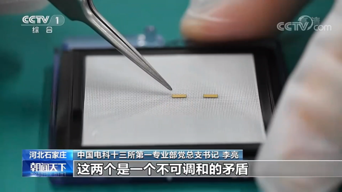 中国电科13所第一专业部党总支书记 李亮:打深了,金属打坏了,打浅了,正面连不上,这要保证孔洞的腐蚀恰好到达芯片上的金属表面,不能厚了也不能薄了,还要同时达到。